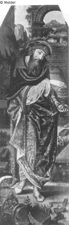 König aus einer Anbetung, Stehend mit nach rechts geneigtem Haupt, in reicher Gewandung, einen Deckelpokal in beiden Händen haltend. Im Hintergrund Blick durch eine Säulenarchitektur in bergige Landschaft