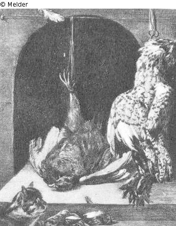 Vor einer rundbogigen Mauernische ein Holztisch; an einer waagerechten Schnur an der Wand sind zwei tote Vögel angebunden: links an längerer Schnur an den Krallen, rechts ein helleres Tier am Hals; links unten im Vordergrund eine Katze mit ausgestreckter Tatze bei einem kleinen toten Vogel; Signatur: Giov. Batta Weenix a 1652 ... (unleserlich); Maße: 80,5 x 67,5 cm