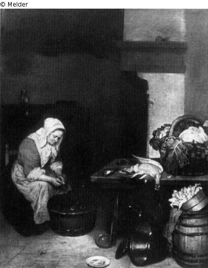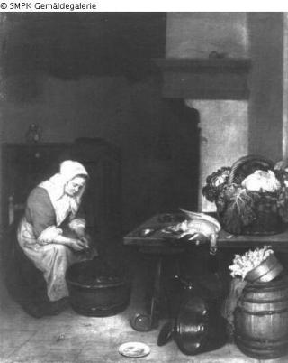 Panel painting: Depiction: Kitchen interior & preparation of food, in the house; interior (situated) & meal; in the house; Inscription on the table top; signature: CN (connected) etscher; dimensions: 72 x 58 cm