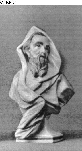Aus einer Folge der Jahreszeiten. Personifiziert durch einen alten Mann mit grauem Vollbart und Kopfhaar. Ein golden geränderter rosavioletter Mantel mit weißer Innenseite bedeckt den Kopf und die gesamte Büste und bildet vor der Brust einen schräg abstehenden Zipfel. Der rechteckige weiße, nach oben eingezogene Büstenfuß ist oben und unten mit Goldlinien abgesetzt. Blaumarke C T unter Krone und B.