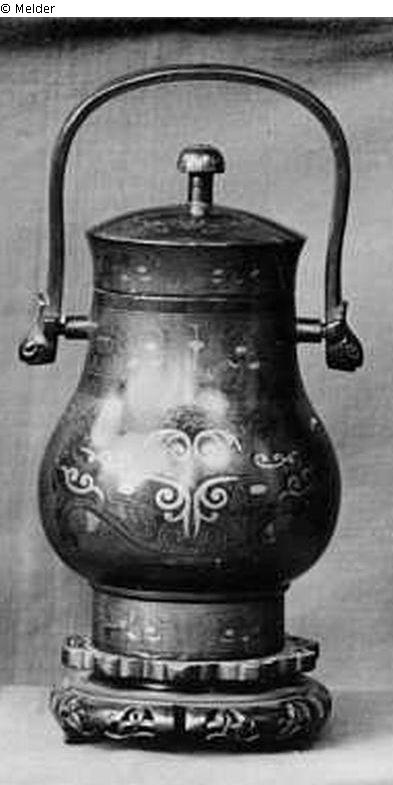 Kleiner bauchiger Deckeltopf mit beweglichem Henkel, Bronze, mit Gold und Silber tauschiert und poliert