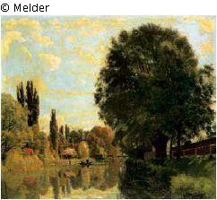 Aarelandschaft bei Thun; bez. unten rechts: 1880. F. Hodler, darunter ältere Signatur: Ferd. Hodler, am rechten Bildrand Spuren der originalen Signatur: F. HOD [...]