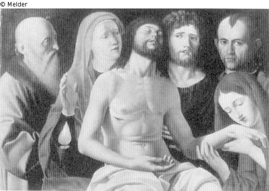 Panel painting: Depiction: the body of Christ being supported & John the Baptist; possible attributes: Book, reed cross, baptismal vessel, honeycomb, lamb, staff & Mary Magdalene, penitent prostitute; possible attributes: Book (or scroll), crown, crown of thorns, crucifix, anointing vessel, mirror, musical instrument, palm branch, rosary, scourge & Joseph of Arimathea, Jewish councillor; possible attributes: Holy Grail, instruments of suffering (eg. three nails, crown of thorns); support& John the Baptist (saint); bowl; cup; honeycomb; lamb; stick; staff; baptismal bowl; reed(grass); cross; book & harlot; Mary Magdalene (saint); Scroll; Crown of thorns; Vessel; Ointment; Mirror; Musical instrument; Palm frond; Rosary; Scourge; Book; Crucifix; Crown & Joseph of Arimathea (Saint); Instruments of suffering; Nail; Crown of thorns.