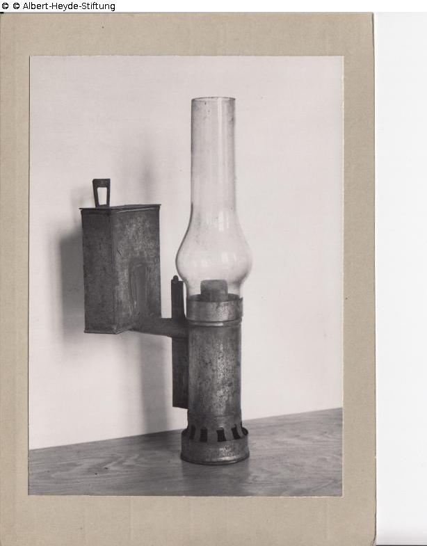 Cylindrical wick container with a bulbous glass cylinder on top. At the back, a box-shaped oil container with an eyelet for hanging on the wall. A light shade was probably never present.