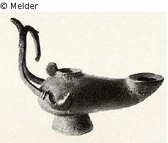 Lampe, länglich, kreisrunder Fuß; geschweifter Henkel mit palmettenartigem Ende. Teile des Henkels abgebrochen.