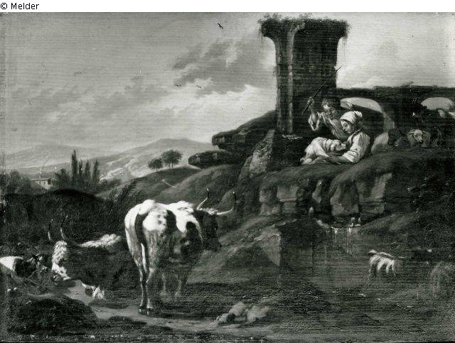 Seit 1880 als Bestandteil einer in zwei Formaten ausgeführten Serie von elf italianisierenden Landschaften im Stil von Rosa die Tivoli im Schloss Charlottenburg nachweisbar.