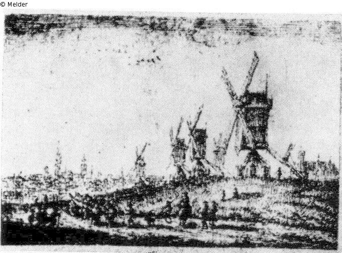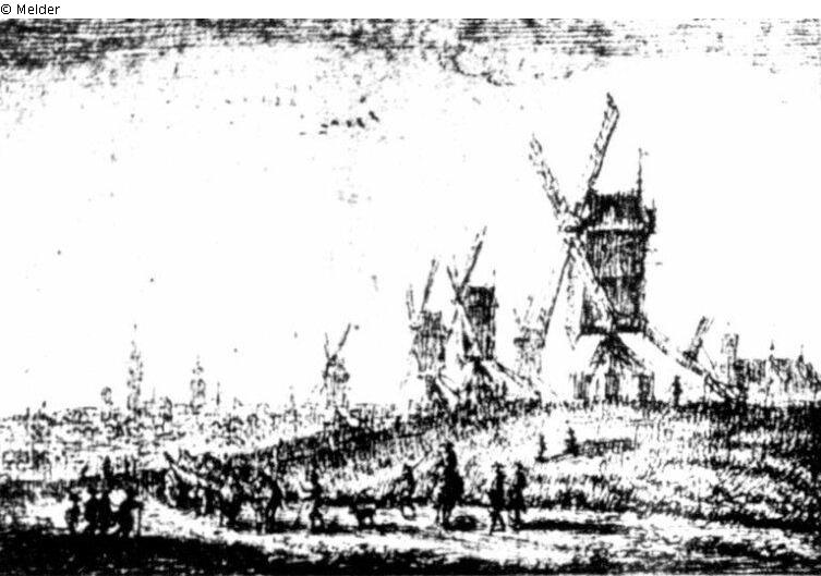 On the left a busy road with a farm cart, in the background the towering town. On the right a small hill with 5 windmills. Signature: Lower left: g. neyts f. Pen in brown.