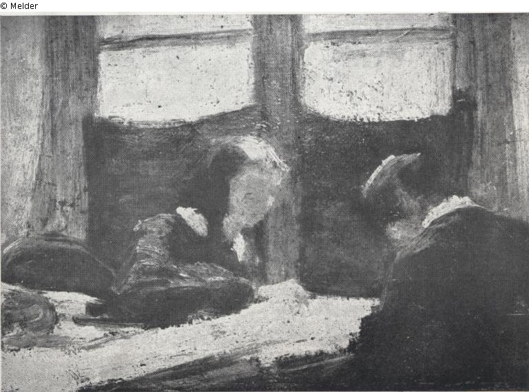 Handwritten note from J. TEMPELAERE: "Les brodeuses: la mère et une sœur de l'artiste, peint vers 1857. Acheté par moi en 1910." ("The embroiderers: the artist's mother and a sister, painted around 1857. Purchased by me in 1910.")