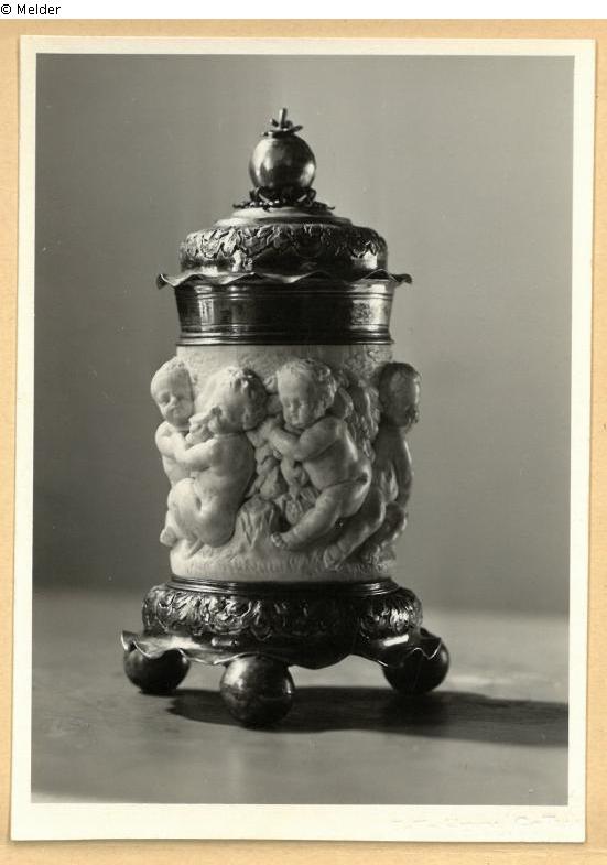 Beaker with silver gilt bowl and foot; pomegranate on the lid; high relief on the bowl's ivory jacket: children with fruits (bacchanalia).