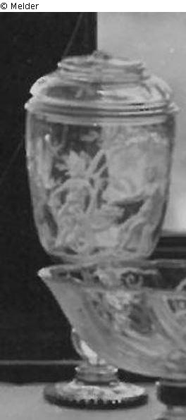 Lidded beaker engraved with Bacchus and Ceres sitting under flowers; insects on the lid; silver-gilt foot; lid knob is missing.