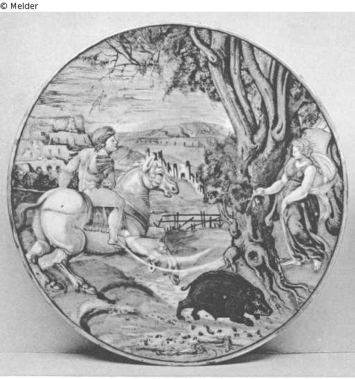 A GUBBIO LUSTRED URBINO DISH, by Maestro Giorgio, with the subject of Picus and Circe ; on the left Picus on a horse pursuing a boar, behind a tree on the right Circe who became enamoured of him and changed him into a woodpecker ; in the distance a river and mountainous landscape, the reverse with a wreath of foliage in ruby and gold lustre and inscribed on the back in ruby " 1533 Mo. Giorgio da Ugubio " and in black "De Pico e Canete ", 1533