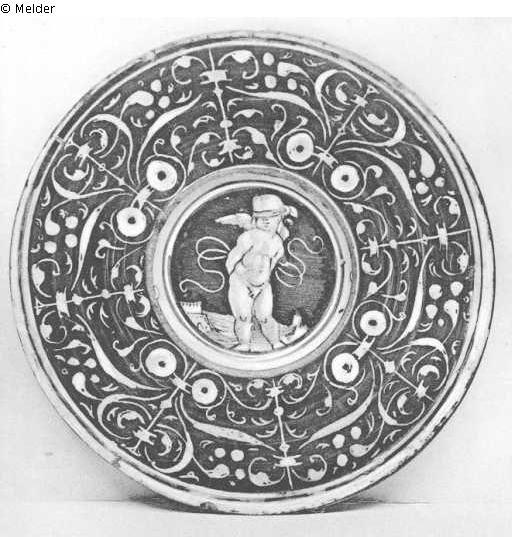 AN ATTRACTIVE GUBBIO LUSTRED PLATE, by Maestro Giorgio, with a full-length figure of Cupid blindfold, in flesh tints against a blue background, the everted rim decorated a candelieri with foliate motifs in gold and pink lustre on a rich blue ground, the underside, with four ruby lustre C scrolls, circa 1535