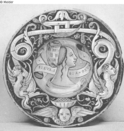 A RARE CASTEL DURANTE LUSTRED PORTRAIT TONDINO, by Maestro Giorgio Andreoli, decorated in the golden sunk centre with a bust portrait of a girl in profile to sinister, her ruby scarf knotted on her bosom and on a white ribbon scroll inscribed " SIL-VAGGIA • DIVA ", the everted rim decorated en grisaille and ruby lustre on a blue ground with a winged human-headed chimera, festoons and a cherub's head supporting a bowl, the underside with ruby scrolls, and on the base the date 1531 and initials Mo. Go., Castel Durante, 1531