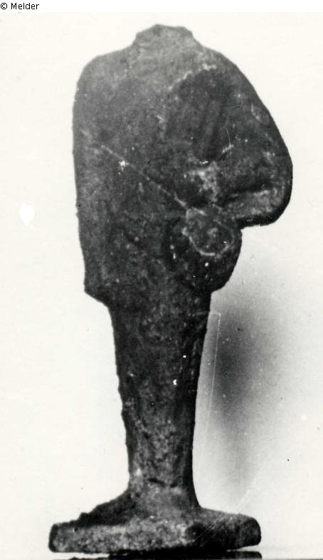 Im archaischen Stil, linkes Bein vorgestellt, die Rechte herabhängend, die Linke hält eine Leier vor dem Leib. Der Kopf fehlt
