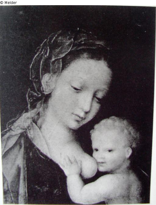 La Vierge et l'Enfant, Madonna mit Kind, Brustbild. Madonna mit rotem Umhang und grünem Kleid, dem Kinde die Brust reichend. Öl auf Holz, 22,4x17cm (21x16), unsign.
