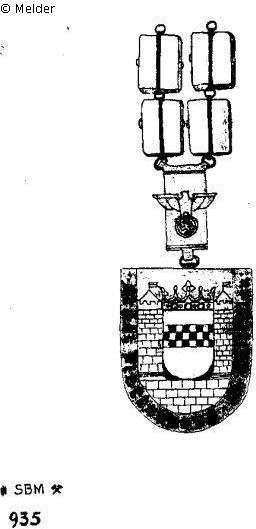 Das Schild ist umrandet mit einer Gravur "Stadt Plettenberg in Westfalen". Ein größeres, flaches Stück Bernstein auf demselben enthält das Stadtwappen. Der Hänger selbst zeigt auf der Bildseite eine Inschrift mit Adler und Hakenkreuz. Die Rückseite trägt die Herstellermarke "SBM", flankiert auf der linken Seite von einem Paar stilisierter Äxte und auf der rechten Seite ein Paar gekreuzter Hämmer. Darunter ist der Feinsilberstempel, 935. Die ungefähre Gesamtlänge beträgt: 56 cm.