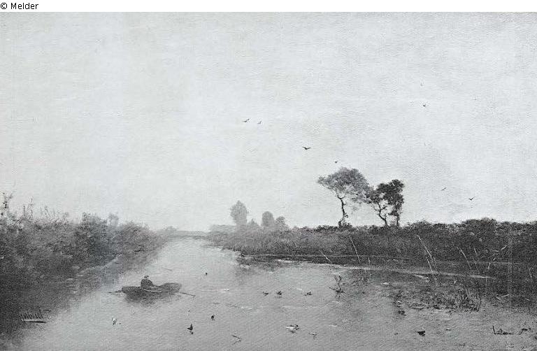 Polder landscape with farmer in rowboat; the banks on both sides are covered with reeds and shrubs. Signed