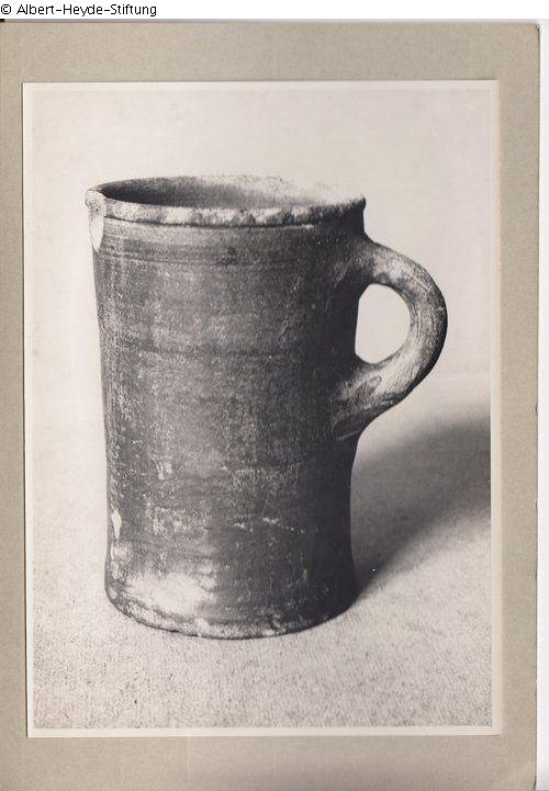 Cylindrical mug with a contrasted mouth and a small, round stable handle. Probably salt-glazed. Cup archaeoarchaeological find.