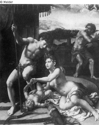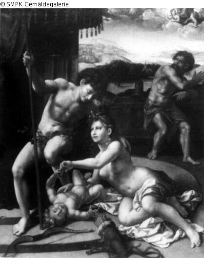 Panel painting: depiction: Mars and Venus are surprised by Vulcan; he catches them with a net; Vulcan; catch; net; surprise