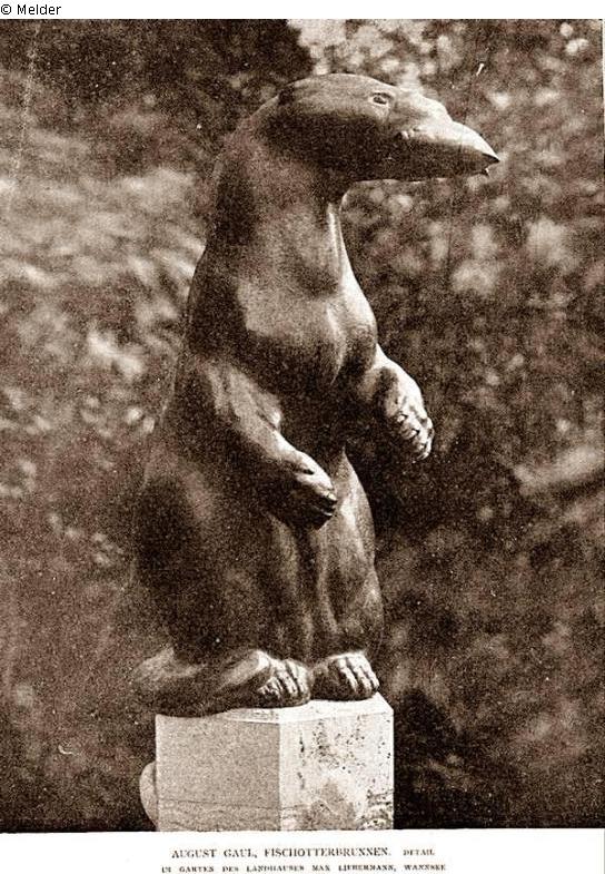 Fountain with otter on stone stele in the garden of Landhaus Liebermann in Wannsee