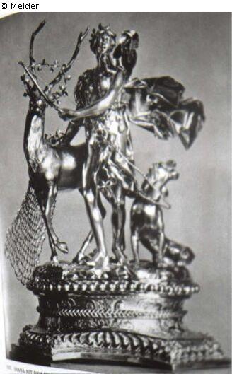 Part of a 17-piece centrepiece: Diana with the stag and dog on a plinth.