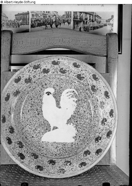 Brownish manganese-sprayed plate. Sponge decoration on the lip. A stenciled rooster on a light background in the center.