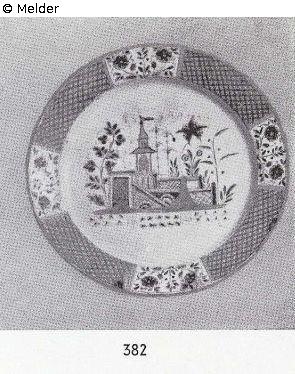 Lepke 1908: 211. PLATE, flat, Chinese-style painting in olive green, blue, yellow, brick red. In the background, walls with gates and towers as well as individual ascending flowers and plants. The masonry is mostly red chequered, partly with blue dots. On the rim, a woven mosaic in olive green with red stars, interrupted by four white fields with flowering shrubs. GB mark in blue under glaze. Rouen, J. Guillibaud factory, around 1730.