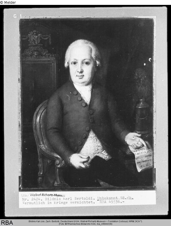 Search Request | Object report Portrait of Karl Josef Zacharias Bertoldi Lost Art-ID585373 Previous Next Artist / Creator Unknown (Deutsch) TitlePortrait of Karl Josef Zacharias Bertoldi Dating1800Object typePaintingGroup of reported objectsPaintingMaterial / TechniqueCanvas / paintedMeasures58,5 x 47 cm Inventory numberWRM 2424Description Inscription at the bottom right: "VICTE [...] / LATI SVIS [...] HVC VIVENTES / PER MANEANT / PICTI". Read more Read less Provenance Wallraf-Richartz-Museum. On loan at the Rheinisches Museum, Cologne-Deutz. Since 1945 whereabouts unknown. Read more Read less Published since30.01.2020 Contact Wallraf-Richartz-Museum & Fondation Corboud Obermarspforten 50667 Köln Germany Phone+49(0)221/221-22372Fax+49(0)221/221-22629Homepagehttp://www.wallraf.museum Contact Dezernat für Kunst und Kultur der Stadt KölnPositionMuseumsreferat, ProvenienzforschungPhone+49(0)221/221-22520E-Mailprovenienzforschung@stadt-koeln.de