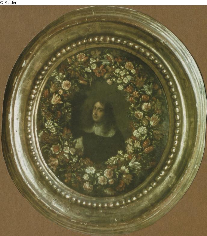 Male portrait with upper body. Looking to the left. Long dark hair, moustache, white shawl collar. Framed by flowers/fruit wreath of various summer flowers and cherries