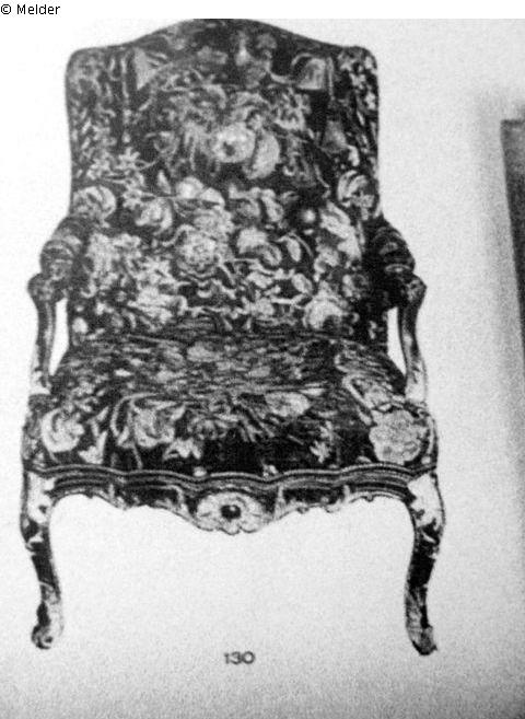 Mit geblümtem Tapisserie-Bezug. Die geschnitzten Teile des Gestells vergoldet, auf braun gebeiztem Grund. Der Bezug sehr reich und farbig gemustert: Blumen und Früchte. Gestell und Bezug Frankreich um 1720