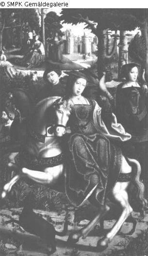 Panel painting: Depiction: Conversion of St. Mary Magdalene hearing Christ preach & life of St. Mary Magdalene before her conversion; e.g. dance, hunt; conversion; Christ; preach; hear & dance; hunt; huntress.
