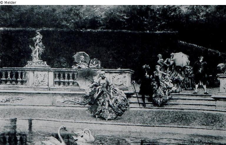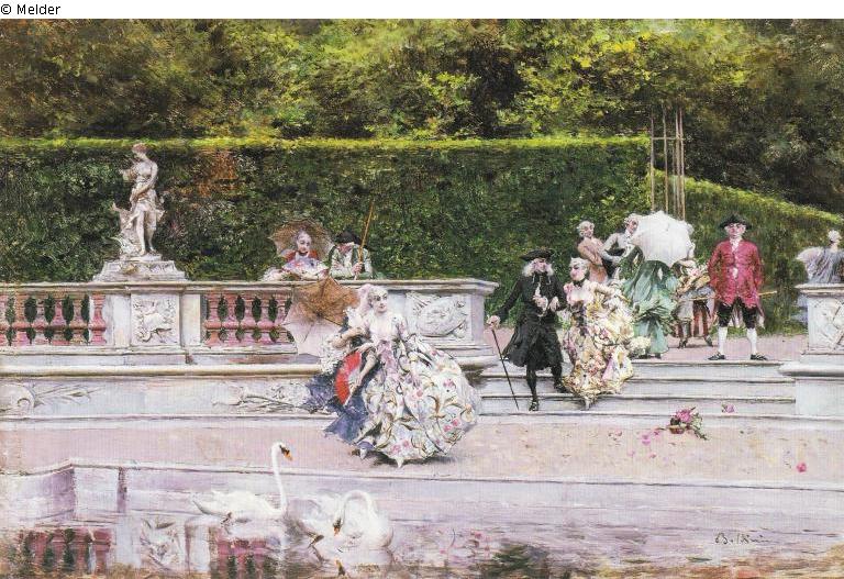 The society comes down the terrace to the water. Swans below; G.-R.; signed; Scène galante (Probably the Parc de Versailles) (Bosquet des Dômes?)