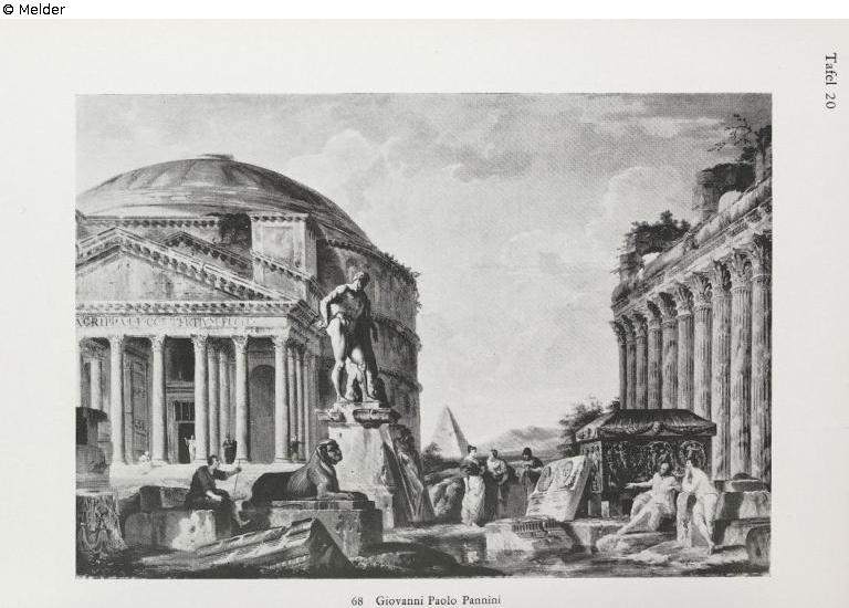 Links das Pantheon, davor die Kolossalstatue des Herkules Farnese, verschiedene antike Fragmente weiter nach rechts; ganz am Rande rechts eine korinthische Tempelfront. Im Hintergrund eine Pyramide. Staffagefiguren. Das Bild ist vorwiegend in gelbgrünen und hellgrauen Farben gehalten. Goldener Rahmen. Aus der ehemaligen Sammlung Cremer (Galeriewerk Cremer, Textband S. 47).