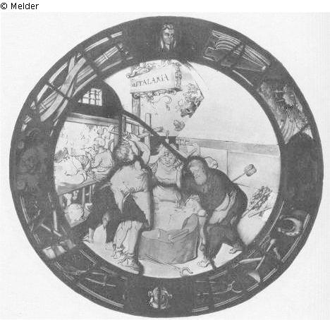 Stained glass. Four men, the oldest of whom wears a blue doublet and two others red trousers, forge the iron that he holds on the anvil. At the back left two workers, seen from behind, on a bench: one is reading in a sheet of paper, the other is working: on the right is the forge with a bellows. On the left one looks through the window onto the street. At the top of the board: METALARIA. Framing with blacksmith's tools. Coloured glass with purple rim.
