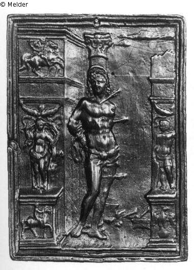 Rechteckige Plakette, rings profilierte Randleiste, in der Mitte oben eine Durchbohrung, am linken Rand eine Druckstelle, auf der Rückseite sechs gekreuzte Einschnitte. In der Mitte steht der Heilige, der an eine Säule gefesselt ist. Sein bis auf ein Lendentuch nackter Körper ist von drei Pfeilen durchbohrt. Links und rechts sieht man Gebäudefragmente mit antikisierenden Reliefs von Reitern, einer Frau, einem Krieger und einem Adler. Hinten liegen Bauteile in Trümmern am Boden. Die Plakette, von der signierte Exemplare nicht bekannt sind, gilt als frühe Arbeit des Moderno. Die Figur kehrt auf Girolamo da Trevisos Altarbild der Madonna del Fiore im Dom von Treviso von 1487, auf dem Stich von Andrea Zoan und auf einem Relief von Caradosso, beschrieben von Ambrogio di Leone in "De Nobilitate Rerum" (1525), wieder. Lewis benannte als Prototyp ein Gemälde von Mantegna, das sich heute in der Ca' d'Oro in Venedig befindet.