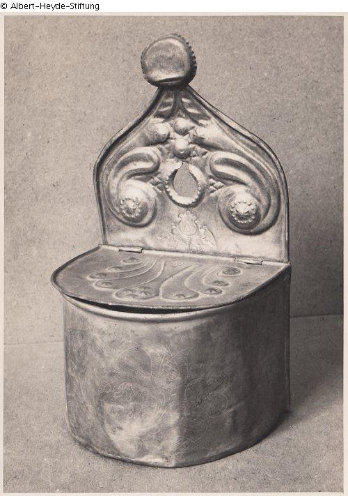 Salt vessel with hinged lid. The lid and back decorated with chased and embossed foliage, fruits and birds. On the front of the vessels body, surrounded by flowering plants, a cartouche with the inscription "DK 1798".