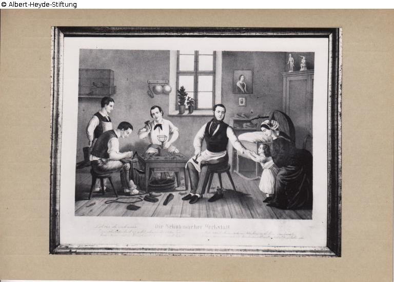 Colored lithograph in gilt/silver frame. The master with two journeymen and an apprentice at the work table, next to him wife and child. Below the image field a legend. Designated "Druck und Verlag A. Folgner, Berlin".