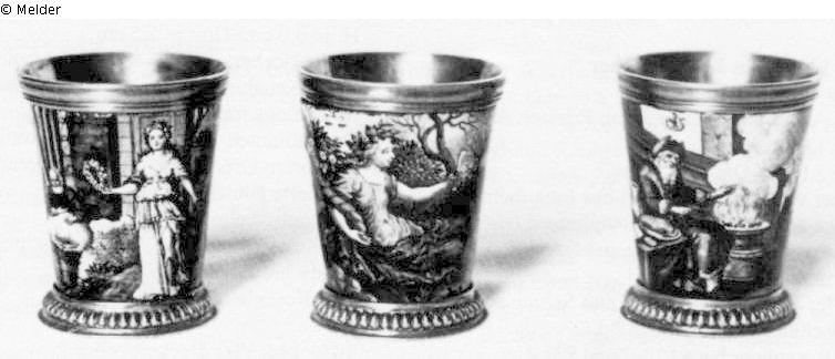 One of six small conical beakers, with enamel painting by J. J. Priester, depicting the Labours of the Month (signed "J. J. Priester. Pin."); belongs to Ahv 366.