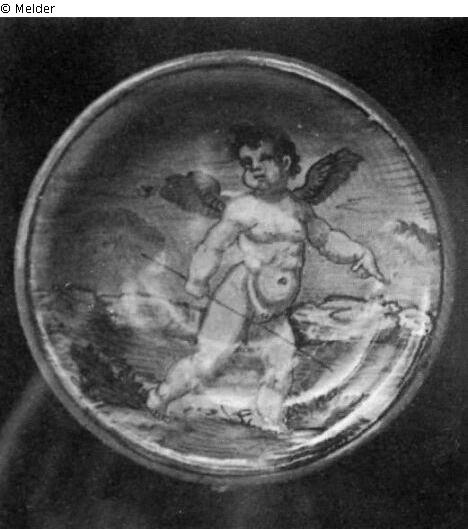 One of four small bowls of the same size; depiction: running Cupid.