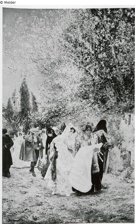 A group of young men and women in colourful festive attire approach the viewer along a wall surmounted by blossoming spring trees, led by the wet nurse with the baptised child in her arms. signed on the bottom right: J. Gallegos 1907