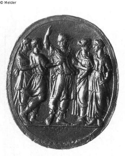 Ovale Plakette, flacher, doppelt geriefter Rand. In der Mitte steht ein bärtiger Alter, der mit erhobenem Arm auf einen Mann und eine Frau einredet, die links neben ihm stehen. Rechts neben dem Alten sieht man zwei weitere Frauen mit einander zugewandten Gesichtern. Alle sind in antike Gewänder gekleidet.