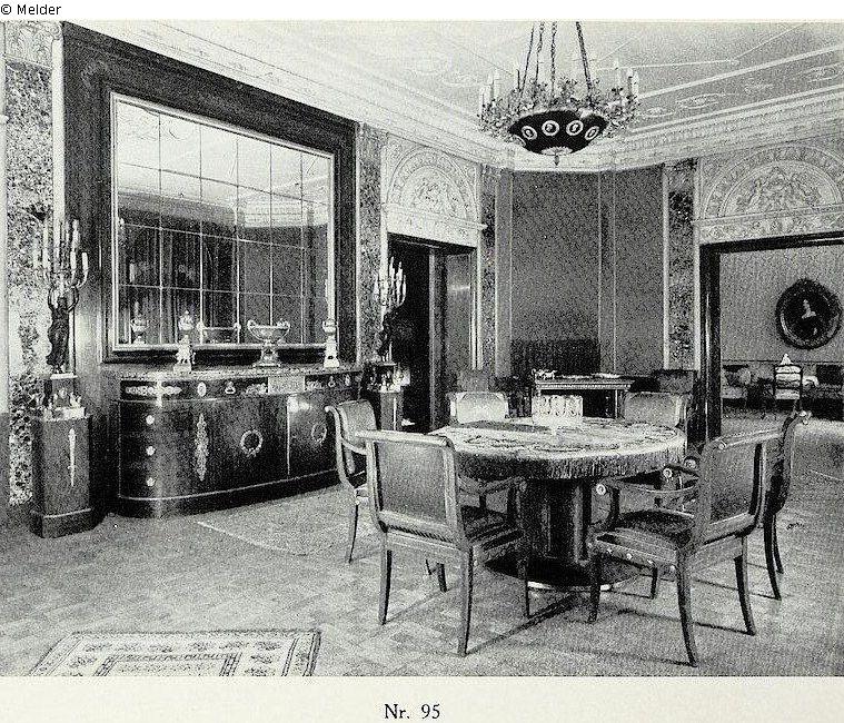 Union 1938: "Mahagoni mit Goldbronzebeschlägen, grüne Brocatello-Bezüge: Gerundetes Büfett mit Marmorplatte (2,47 m), zwei Anrichten mit Marmorplatten (1,50 m), ovaler Ausziehtisch mit Einlagen und passender Seidenveloursdecke mit Stickerei, 23 Sessel mit Schonern. Abbildung Tafel 7"