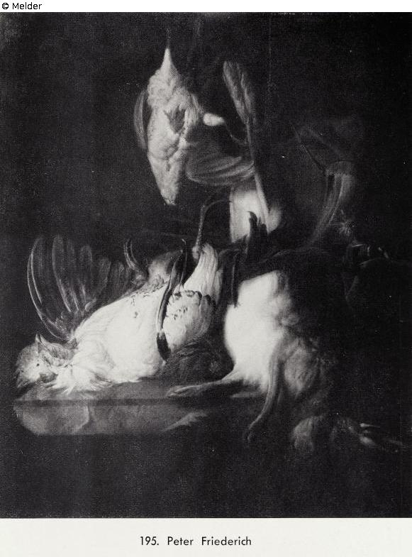 The painting was shown in summer 1925 at Städelschen Kunstinstitut at the exhibition "Ausstellung von Meisterwerken Alter Malerei aus Privatbesitz" with the information "Peter Friderich, unknown German master of the 17th century", description of motif "Still-life: Rabbit, cock, partridge" signed at lower right: Peter Friderich. Measurements given there height 1,138 m, wigth 0,968 m. See also "Vorläufiges Verzeichnis der Ausstellung von Meisterwerken Alter Malerei aus Privatbesitz im Städelschen Kunstinstitut, Frankfurt a. M., Sommer 1925", Catalogue Pos. 82.