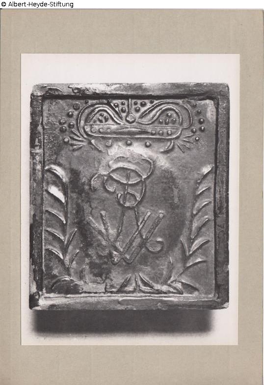 Rectangular, black glazed oven tile with simple frame. Then a laurel-wreathed cartouche with the crowned monogram „FWR“ (King Frederick William I).