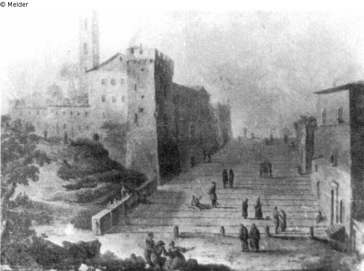 A wide street with steps rising upwards. On the left of the street is a fortress-like building with a square donjon.