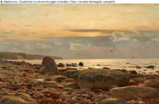 Signed lower left: E. Drücker 1887. In front the beach with big stone blocks, on the left the coast, on the right the Baltic Sea. Only swell waves are breaking at the cliffs. Behind a grey fog bank the red disc of the rising sun is visible. The sea reflects the morning brightness silvery white. Only seagulls enliven the beach solitude.
