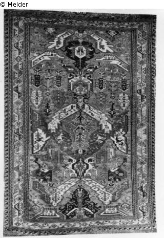 Tapestry carpet in woven Gobelin technique (Sumakh.), pale red ground. Pattern figure, large, white leaf-like etc. (fields with geometric motifs, border continues, yellow in the center).
