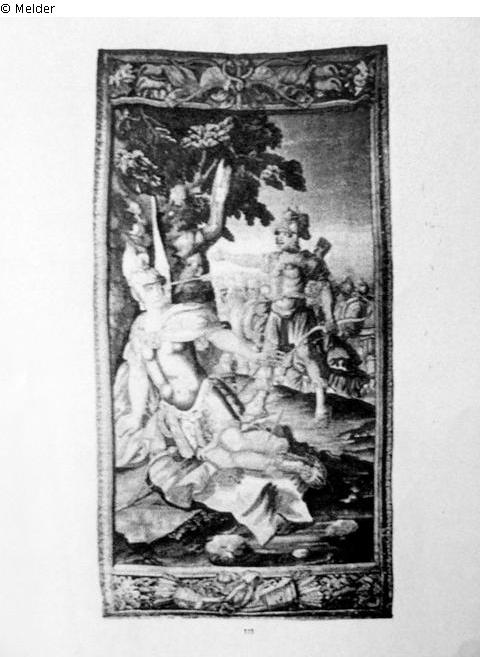 Altrömische Schlachtenszene. Zu Füßen eines großen Baumes ist ein Krieger, von mehreren Pfeilen getroffen, zusammengesunken. Vor ihm steht sein siegreicher Gegner, im Hintergrund das römische Heer. Palmettenbordüre mit breiten Kopf- und Fußleisten, auf diesen militärische Embleme.