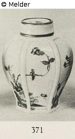 Six-sided, bulged.Colorful painted and lustrated with Chinese blossoms, rocks and hurdles. Without brand.