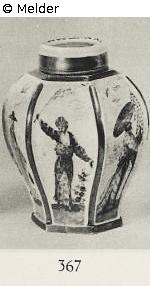Six-sided, bulged, grooves are gilded. Colorful Höroldt Painting. In each field is a Chinese. Without brand.